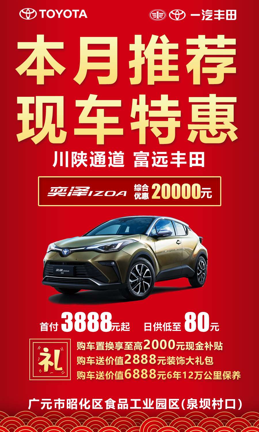 本月好车特惠-【一汽丰田-奕泽】 颜值高/动力强/安全优/油耗低至4.5L 1万公里才保养1次、耐用耐造易养活 本月购车首付低至3888元起,日供低至80元 旧车置换奕泽至高享2000元现金补贴 本月购车享价值2888元装饰大礼包 本月购车再享价值6888元6年12万公里免费保养 广元富远丰田4S店,热线:16508390825 ,地址:广元市昭化区食品工业园区(泉坝村口) 。 到店谈更便宜,实际成交价格低于网络报价!导航!广元富远丰田汽车销售服务有限公司!即可直达!